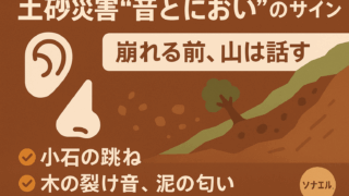 豪雨や濃霧のときは視界より耳と鼻が頼り。崩れる直前の斜面は、必ず“音”と“におい”でヒントを出します。気づいた瞬間にその場から離れる準備を。 音のサイン:耳で聞く“崩れのプロローグ” パチパチ/コロコロ(小石の跳ね)表土が剝がれ始める初期音...