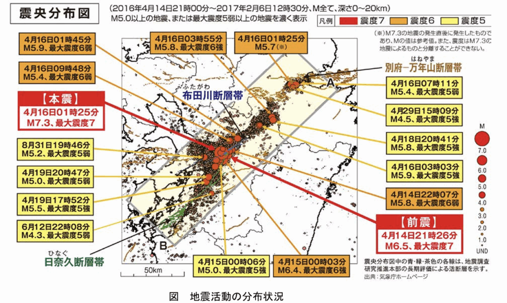 熊本県熊本地方を震源とする熊本地震は二度、震度7を観測する地震でした。その後も5日間で2000回の有感地震を記録しています。